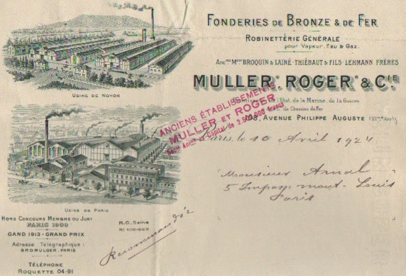 La fonderie Broquin et Lainé est reprise par la fonderie Muller, Roger & Cie. Sur une facture de 1924, l’entreprise mentionnait encore à l’époque les maisons qu’elle avait intégrées : Broquin & Lainé, Thiébaut & Fils, Lehmann Frères. Outre l’usine de l’avenue Philippe-Auguste, Muller & Roger disposait d’une grande fonderie à Noyon (Oise). Source : lafabriquedeparis.blogspot.com/2014/05/lehmann-brothers-version-industrie.html – http://4.bp.blogspot.com/-IE-QEWu2DIc/U2ZM4bxi87I/AAAAAAAABKQ/zN5rQpsnTvs/s1600/Lehmann+Fr%C3%A8res+st+maur+facture+muller.JPG